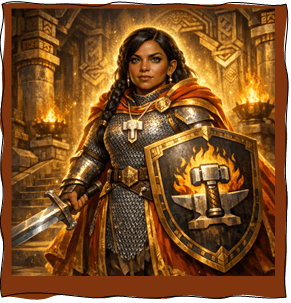 Upon that loss, she forged her own vow. Devoting herself to Mordain the Soulforger, Andarna took up the mantle of a holy warrior. She set forth into Etharis to seek companions of courage and conviction—those willing to stand against the Evil that had broken her people. For only by cleansing the land of its darkness could the dwarves reclaim Underhall and fulfill her father’s long‑dreamed hope.