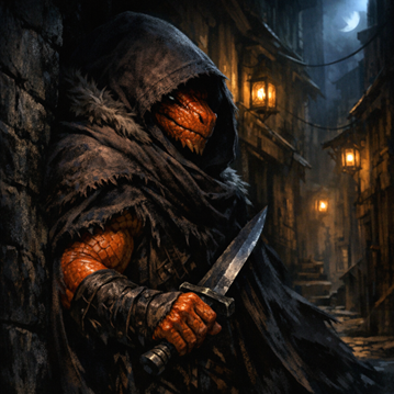 The world beyond the mountains was harsh and unforgiving. In bustling towns and shadowed villages, Zarcha learned that brute strength alone would not fill his belly or keep him safe. He watched, listened, and adapted—picking up the subtle arts of thieves and spies, learning to move unseen, to read the secrets in a stranger’s eyes, and to make a quick coin when hunger gnawed. The Cobblestone Guild became both sanctuary and crucible. Among its ranks, Zarcha found a new kind of kinship: loyalty not to blood, but to those who shared the shadows and the risks.