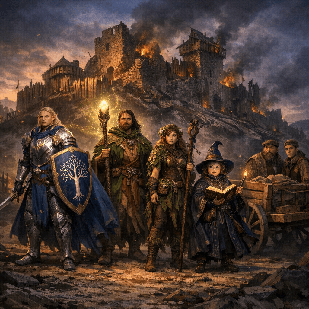 In the sprawling, storied city of Waterdeep—where towers pierce the mist and the bustle of merchants fills the air—four unlikely companions found their destinies entwined. Vynlel Shieldfallow, the steadfast paladin; Arkoda Orso, the gentle druid; Morrigan Nightwing, the enigmatic wizard; and Amanita Cedar-Shake, the sage of the wilds, answered the summons of Ottis Larkmar, master of the Larkmar & Sons trading company. Their quest: to uncover the fate of a vanished shipment bound for the Lionshield Coasters in the distant village of Nightstone.
