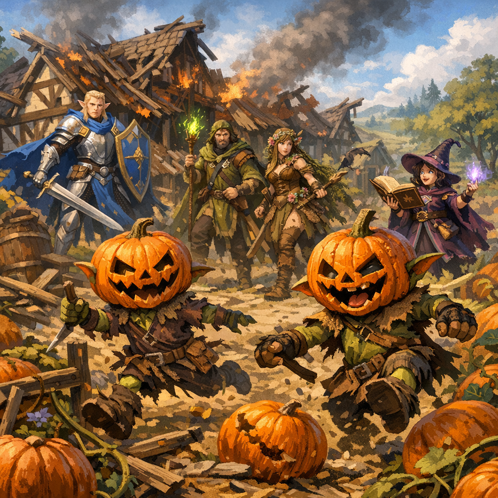 Their path soon led them to a pumpkin patch, where two goblins, lost in foolish revelry, met swift justice. But danger was ever near; an ambush by goblin archers in a crumbling guard tower left Vynlel grievously wounded, an arrow felling the paladin. With courage and magic, the party overcame their foes and stabilized their fallen friend.