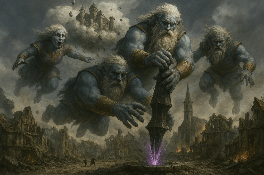 From it, enormous boulders had fallen like the fists of giants, crushing homes, walls, and lives alike. Then the cloud giants themselves descended, seizing the town’s namesake—the great obelisk known as the Night Stone. With unnatural ease they lifted it skyward, vanishing into the clouds and leaving devastation in their wake.