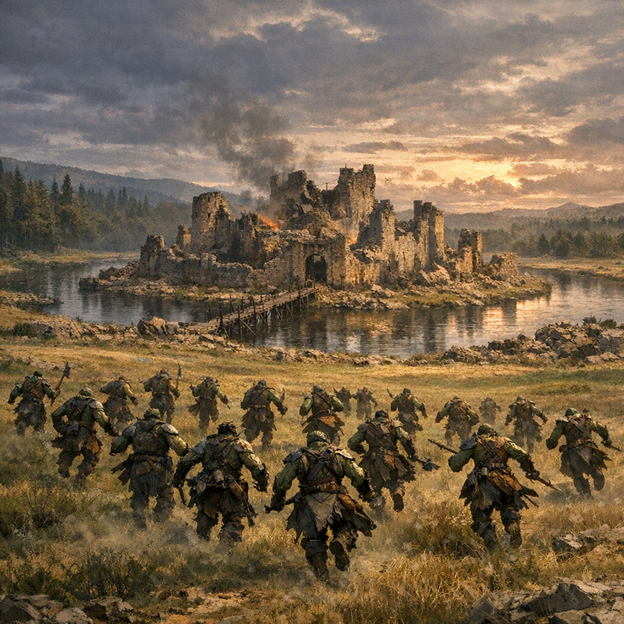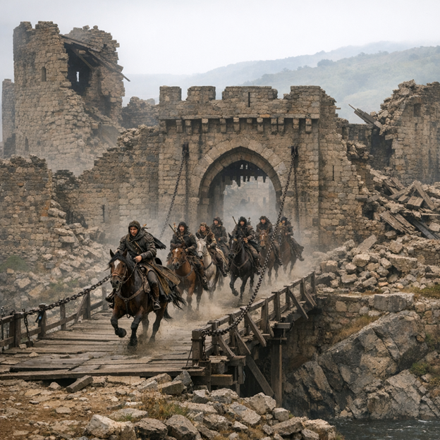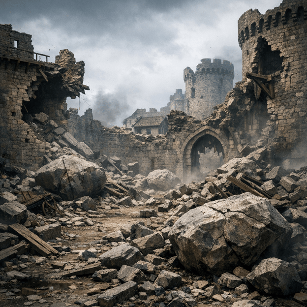 Crossing the shattered remains of Nightstone’s drawbridge, the company stared in disbelief at the ruin before them. The inner bailey of Castle Nandar lay broken, stone torn from stone as if by a god’s careless hand. In the great hall they found four surviving guards, pale and shaken, who told of the disaster.