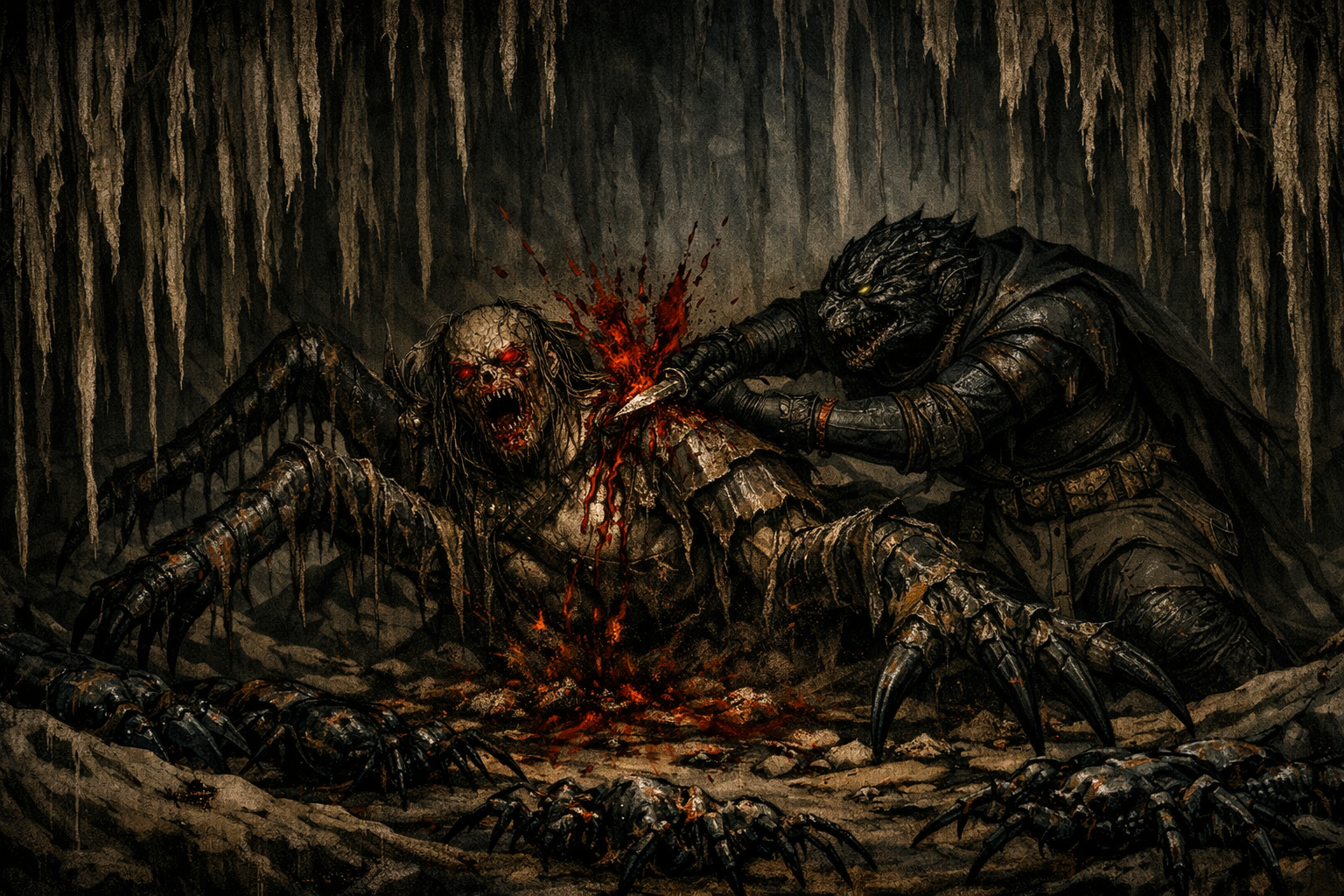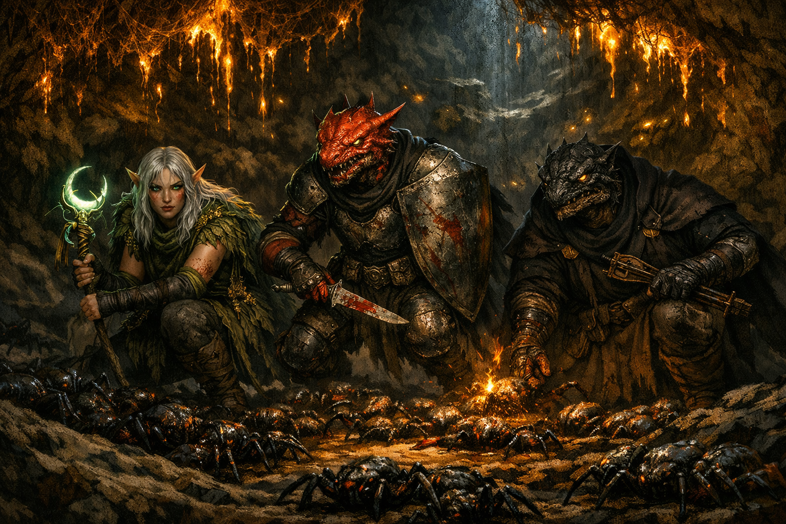Deeper in, the party pushed into a wider chamberand the floor moved. A Spythronar spider swarm boiled out of cracks and shadows, a chittering tide that climbed boots and blades alike. The battle was long and bloody: Sim darted in a blur of steps, Zarcha held the line when the press threatened to drown them, and Deacon struck where he could, but even so all three took grievous wounds before the last of the monstrosities was finally crushed and scattered. When silence returned, it did not feel like peaceonly the brief pause of a dungeon drawing breath.